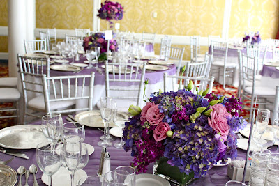 | The bridesmaids' bouquets were designed on a smaller scale with vibrant shades of purple. The bouquet had purple hydrangeas, lavender freesia, dark blue delphinium, lisianthus, and violet stock. |